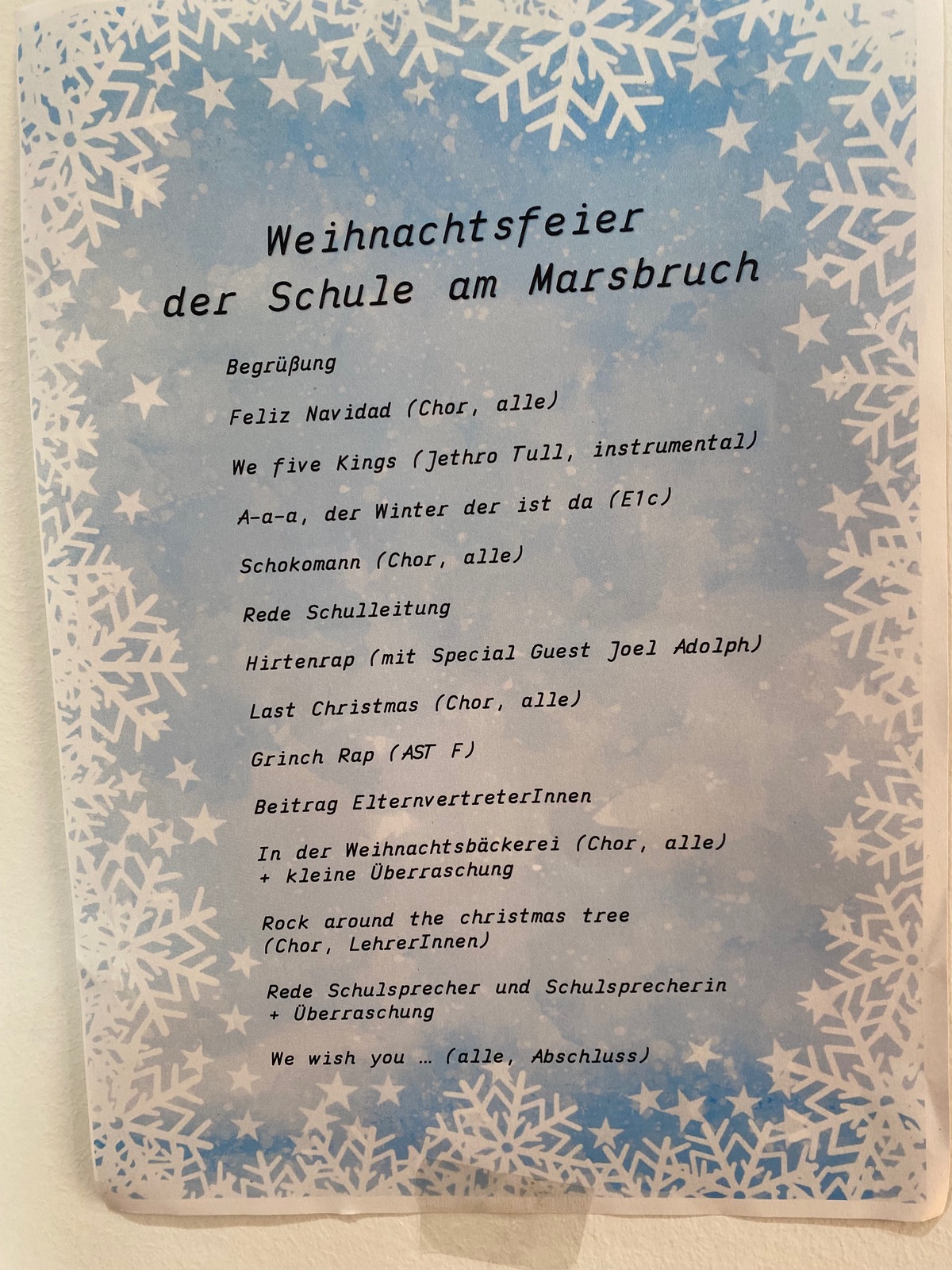 Danke an den Schulchor und die Schulband für die tolle Musik und an die MST für die Orga und die Plätzchen.
