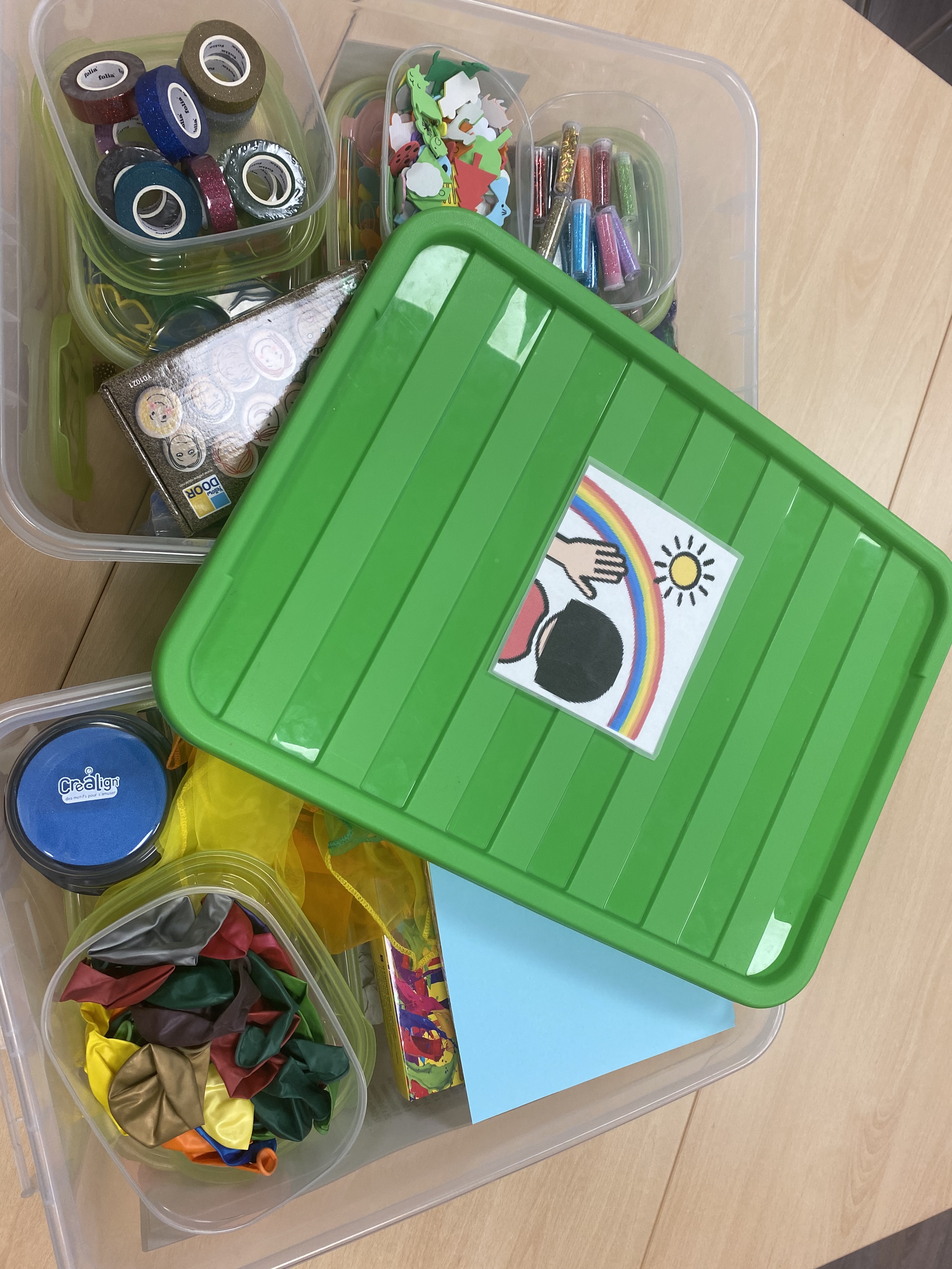 Es wurden zwei Boxen mit verschiedenen Verbrauchsmaterialien bestückt. Die betroffenen Klassen können diese zur kreativen Trauerverarbeitung ausleihen und nutzen. Die Boxen befinden sich im Diagnostikraum.