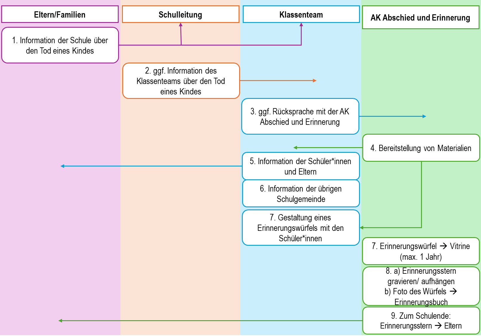 Die Klasse gestaltet einen Erinnerungswürfel für die/den Verstorbene/n nach eigenen Vorstellungen. Der Würfel verbleibt so lange in der Klasse, bis die Gemeinschaft entscheidet, dass er für eine begrenzte Zeit (maximal ein Jahr) in der Vitrine in der Eingangshalle der Schule aufgestellt werden soll. Das Foto des Würfels wird dann in das sich ebenfalls in der Vitrine befindende Erinnerungsbuch überführt. Zudem wird ein Erinnerungsstern mit dem Namen der/des Verstorbenen versehen. Dieser findet seinen Platz in dem Erinnerungsbaum auf den Schulhof.