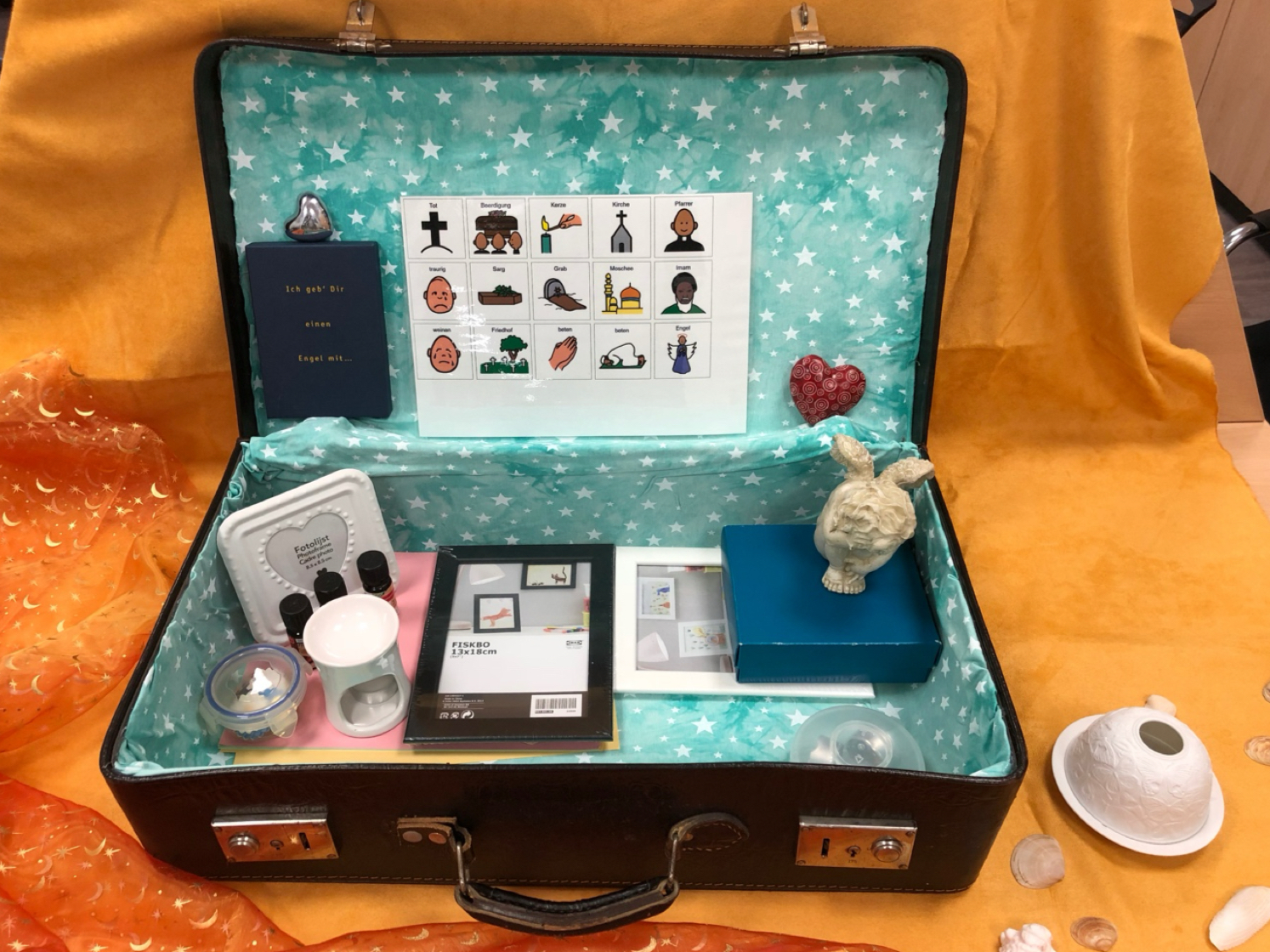 Der gestaltete Koffer ist gefüllt mit Materialien zur ersten Aufarbeitung eines Trauerfalls in den Klassen. Eine mit den Materialien gestaltete Mitte bietet Anlass für Gespräche über den verstorbenen Mitschüler oder die eigenen Gefühle. Eine Erinnerungsecke in der Klasse kann spontan mit dem angebotenen Material eingerichtet werden. Der Koffer befindet sich im Diagnostikraum.